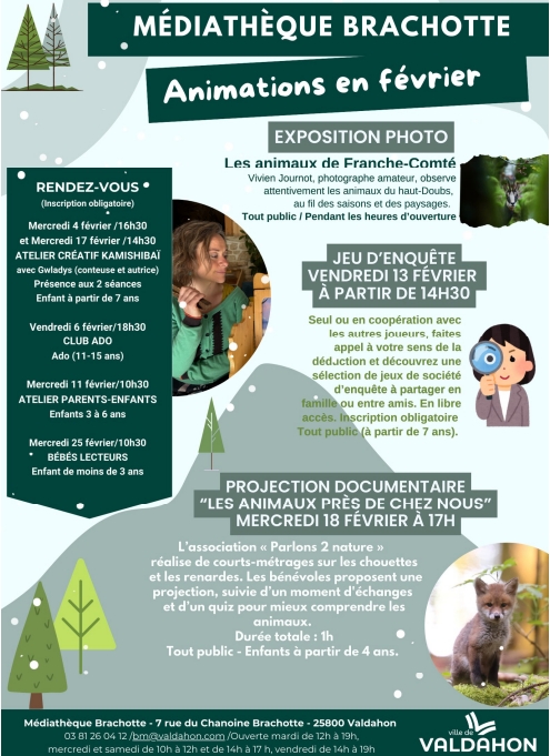 Nous donnons rendez-vous aux enfants (et leur famille 🥰), le mercredi 18 février, à 17h, à la médiathèque Brachotte de Valdahon, pour rencontrer Zoé la petite renarde et Théo le bébé chouette chevêche !